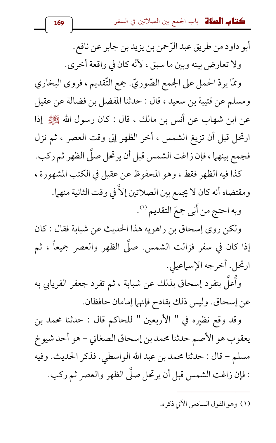 ولكن روى إسحاق بن راهويه هذا الحديث عن شبابة فقال: كان إذا كان في سفر فزالت الشمس. صلَّى الظهر والعصر جميعاً , ثم ارتحل. أخرجه الإسماعيلي.
