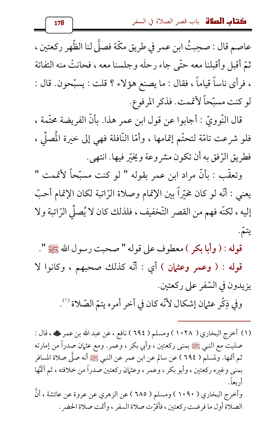 عاصم قال: صحِبتُ ابن عمر في طريق مكّة فصلَّى لنا الظّهر ركعتين، ثمّ أقبل وأقبلنا معه حتّى جاء رحلَه وجلسنا معه، فحانتْ منه التفاتة , فرأى ناساً قياماً , فقال: ما يصنع هؤلاء؟ قلت: يسبّحون. قال: لو كنت مسبّحاً لأتممت. فذكر المرفوع.