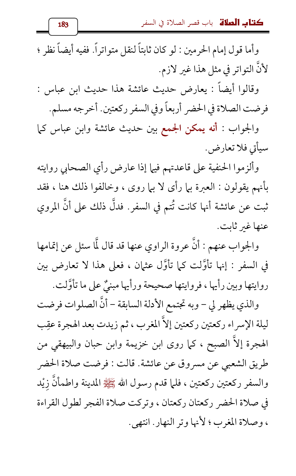 والجواب عنهم: أنَّ عروة الراوي عنها قد قال لَمَّا سئل عن إتمامها في السفر: إنها تأوَّلت كما تأوَّل عثمان، فعلى هذا لا تعارض بين روايتها وبين رأيها، فروايتها صحيحة ورأيها مبنيٌ على ما تأوَّلت.