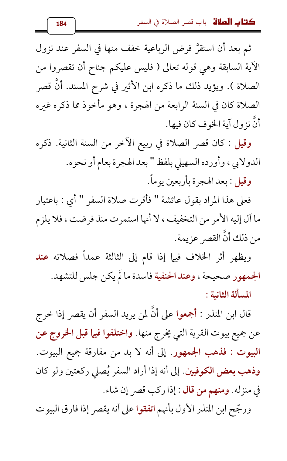 ورجّح ابن المنذر الأول بأنهم اتفقوا على أنه يقصر إذا فارق البيوت