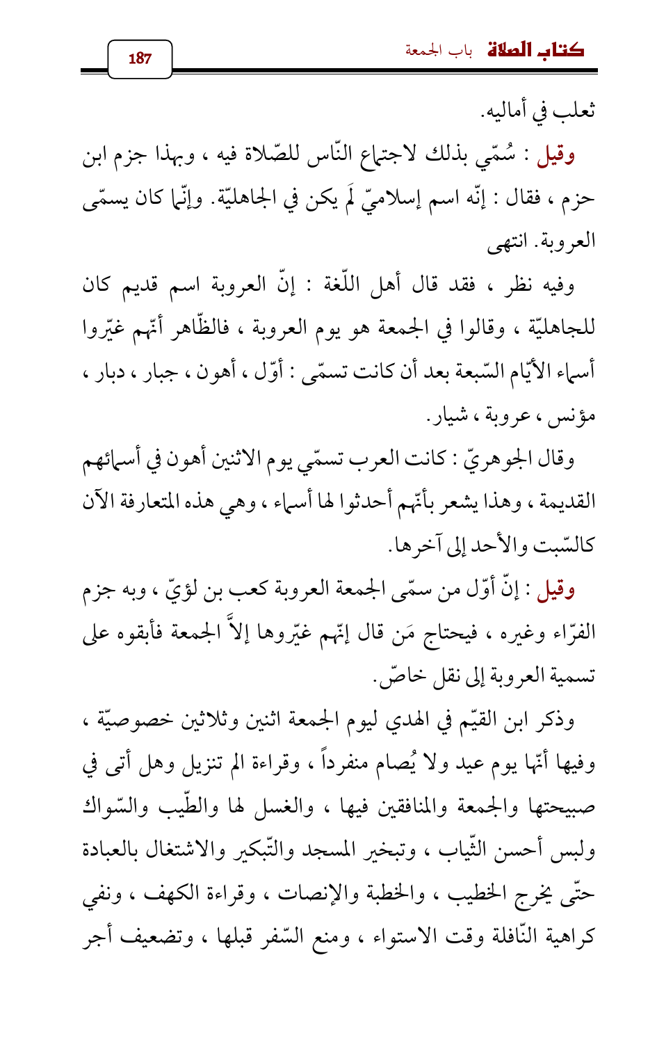 وقيل: إنّ أوّل من سمّى الجمعة العروبة كعب بن لؤيّ , وبه جزم الفرّاء وغيره، فيحتاج مَن قال إنّهم غيّروها إلاَّ الجمعة فأبقوه على تسمية العروبة إلى نقل خاصّ.