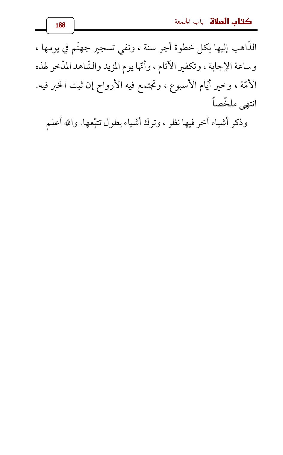 الذّاهب إليها بكل خطوة أجر سنة، ونفي تسجير جهنّم في يومها، وساعة الإجابة، وتكفير الآثام، وأنّها يوم المزيد والشّاهد المدّخر لهذه الأمّة، وخير أيّام الأسبوع، وتجتمع فيه الأرواح إن ثبت الخبر فيه. انتهى ملخّصاً