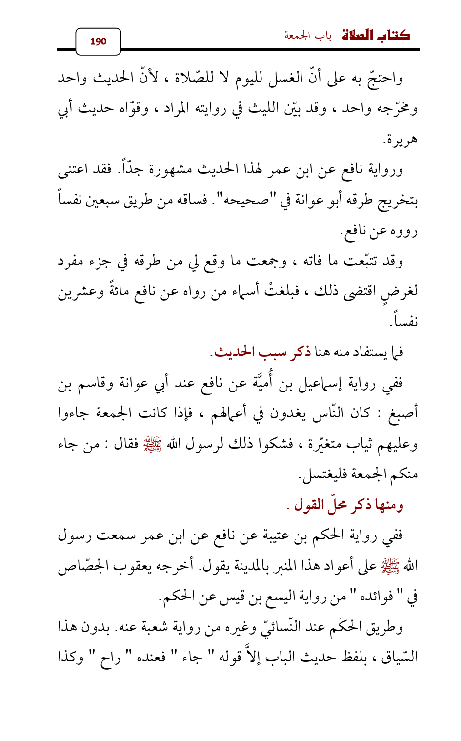 ورواية نافع عن ابن عمر لهذا الحديث مشهورة جدّاً. فقد اعتنى بتخريج طرقه أبو عوانة في " صحيحه ". فساقه من طريق سبعين نفساً رووه عن نافع.