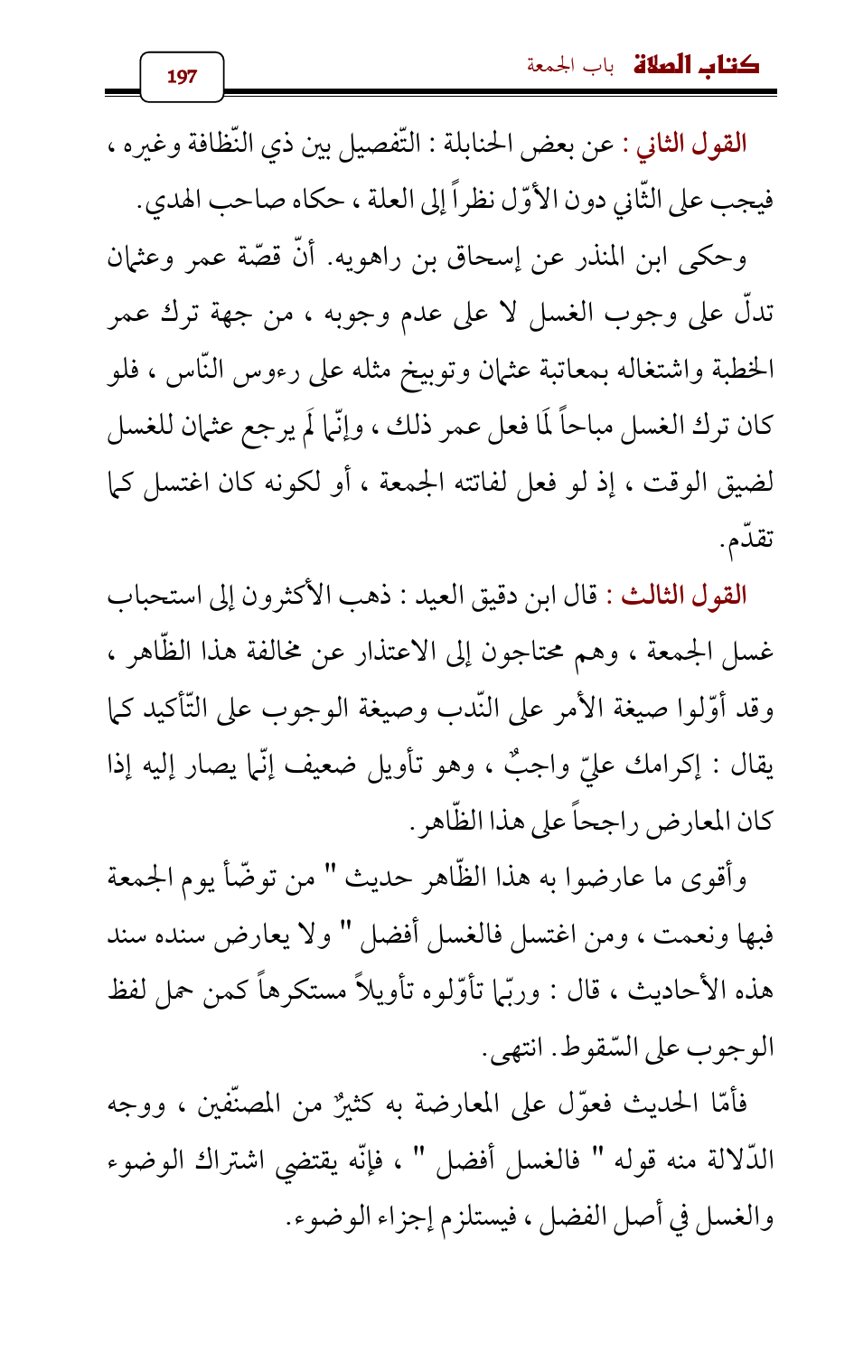 القول الثالث: قال ابن دقيق العيد: ذهب الأكثرون إلى استحباب غسل الجمعة , وهم محتاجون إلى الاعتذار عن مخالفة هذا الظّاهر، وقد أوّلوا صيغة الأمر على النّدب وصيغة الوجوب على التّأكيد كما يقال: إكرامك عليّ واجبٌ، وهو تأويل ضعيف إنّما يصار إليه إذا كان المعارض راجحاً على هذا الظّاهر.