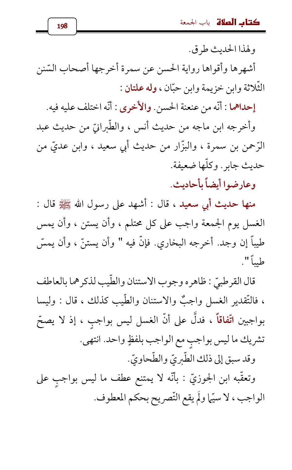 قال القرطبيّ: ظاهره وجوب الاستنان والطّيب لذكرهما بالعاطف، فالتّقدير الغسل واجبٌ والاستنان والطّيب كذلك، قال: وليسا بواجبين اتّفاقاً، فدلَّ على أنّ الغسل ليس بواجبٍ، إذ لا يصحّ تشريك ما ليس بواجبٍ مع الواجب بلفظٍ واحد. انتهى.