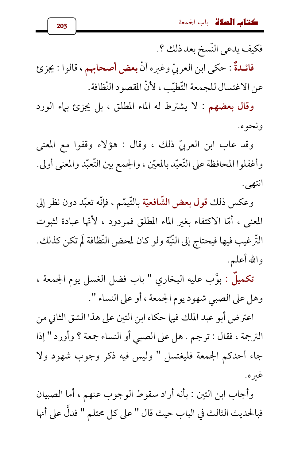 وأجاب ابن التين: بأنه أراد سقوط الوجوب عنهم، أما الصبيان فبالحديث الثالث في الباب حيث قال " على كل محتلم " فدلَّ على أنها