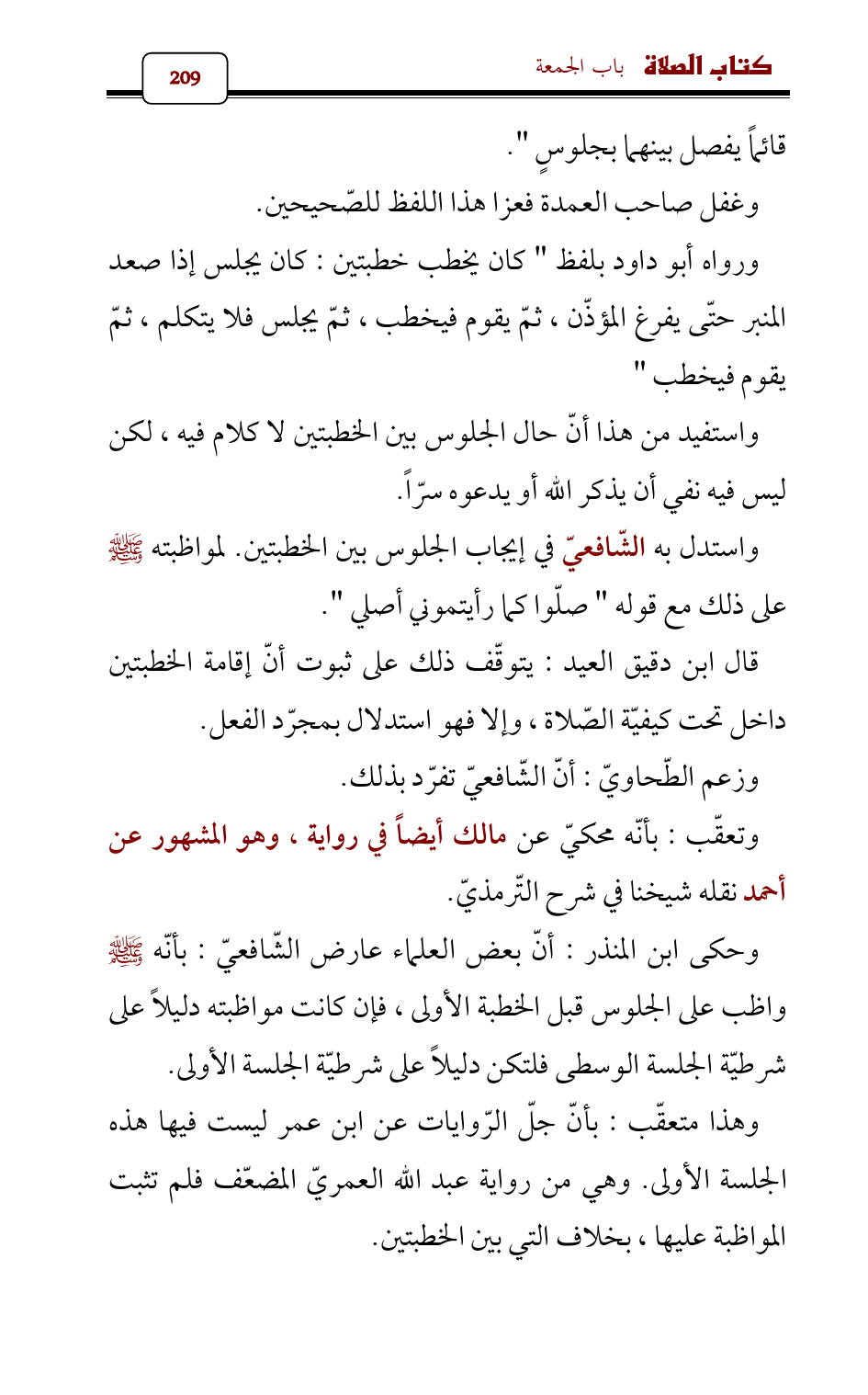 وهذا متعقّب: بأنّ جلّ الرّوايات عن ابن عمر ليست فيها هذه الجلسة الأولى. وهي من رواية عبد الله العمريّ المضعّف فلم تثبت المواظبة عليها، بخلاف التي بين الخطبتين.