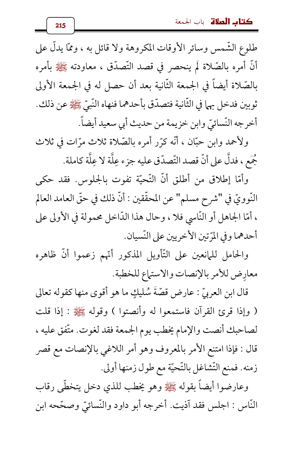 وعارضوا أيضاً بقوله - صلى الله عليه وسلم - وهو يخطب للذي دخل يتخطّى رقاب النّاس: اجلس فقد آذيت. أخرجه أبو داود والنّسائيّ وصحّحه ابن