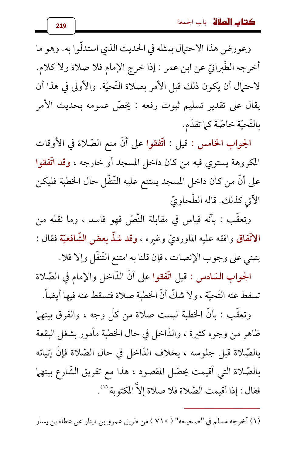 وعورض هذا الاحتمال بمثله في الحديث الذي استدلّوا به. وهو ما أخرجه الطّبرانيّ عن ابن عمر: إذا خرج الإمام فلا صلاة ولا كلام. لاحتمال أن يكون ذلك قبل الأمر بصلاة التّحيّة. والأولى في هذا أن يقال على تقدير تسليم ثبوت رفعه: يخصّ عمومه بحديث الأمر بالتّحيّة خاصّة كما تقدّم.