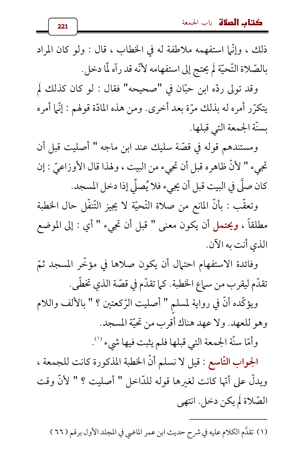 الجواب التّاسع: قيل لا نسلم أنّ الخطبة المذكورة كانت للجمعة، ويدلّ على أنّها كانت لغيرها قوله للدّاخل " أصليت؟ " لأنّ وقت الصّلاة لَم يكن دخل. انتهى
