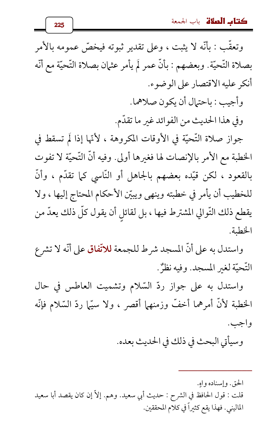 واستدل به على أنّ المسجد شرط للجمعة للاتّفاق على أنّه لا تشرع التّحيّة لغير المسجد. وفيه نظرٌ.