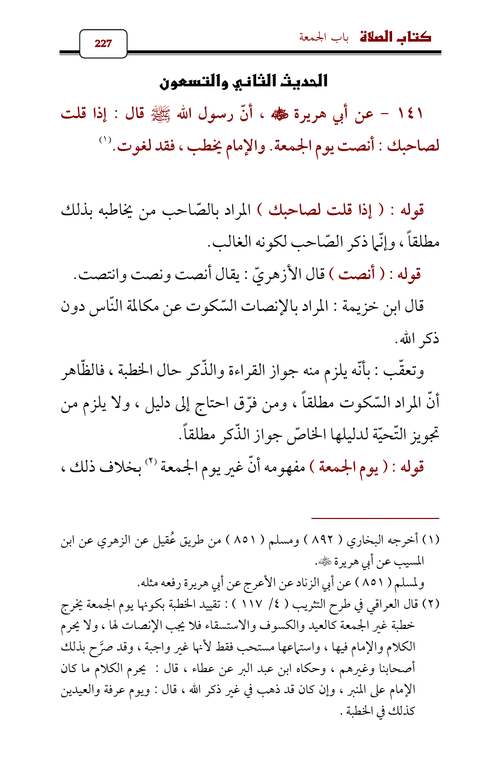 141 - عن أبي هريرة - رضي الله عنه - , أنّ رسول الله - صلى الله عليه وسلم - قال: إذا قلت لصاحبك: أنصت يوم الجمعة. والإمام يخطب , فقد لغوت. (¬1)