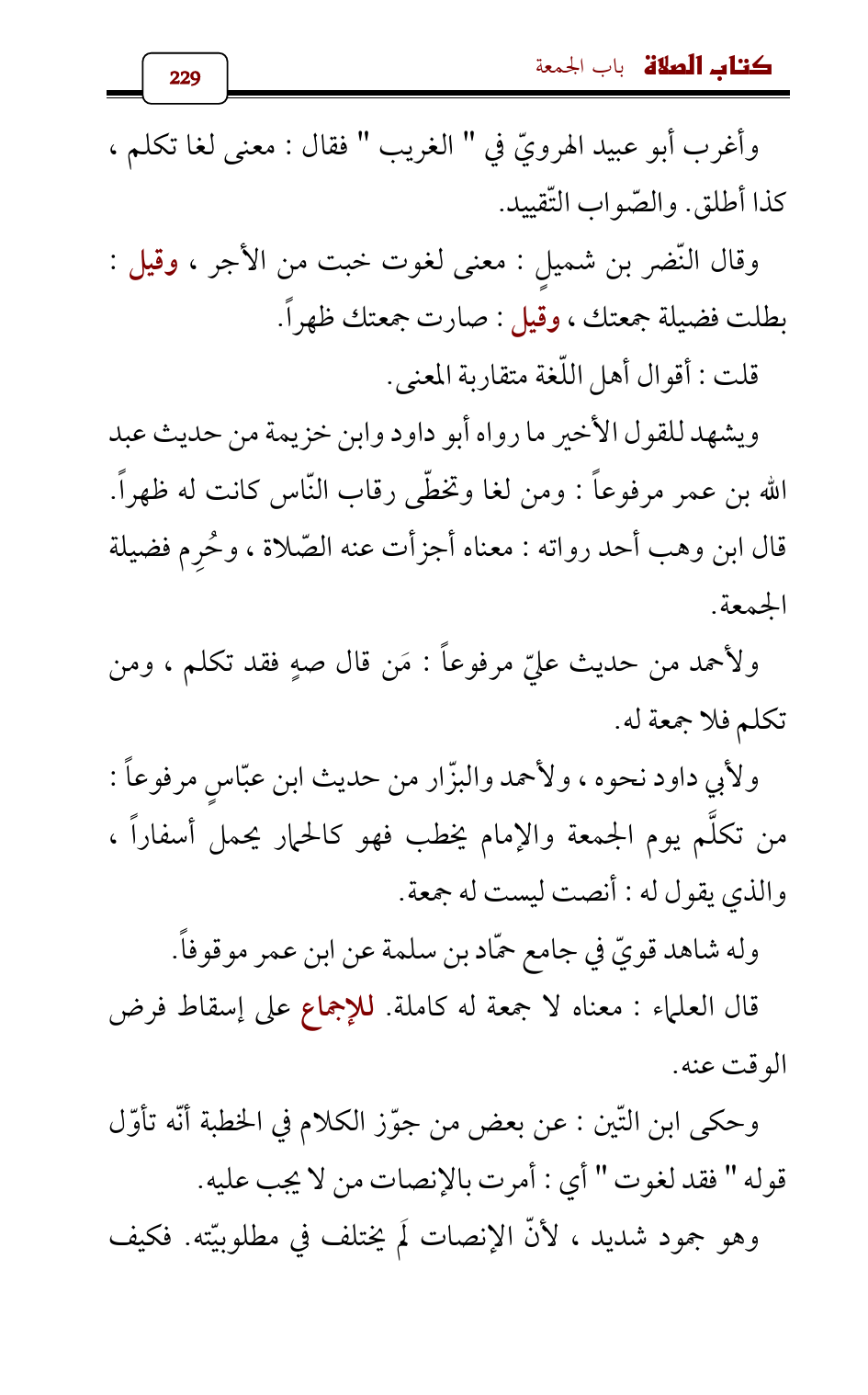 وقال النّضر بن شميلٍ: معنى لغوت خبت من الأجر، وقيل: بطلت فضيلة جمعتك، وقيل: صارت جمعتك ظهراً.