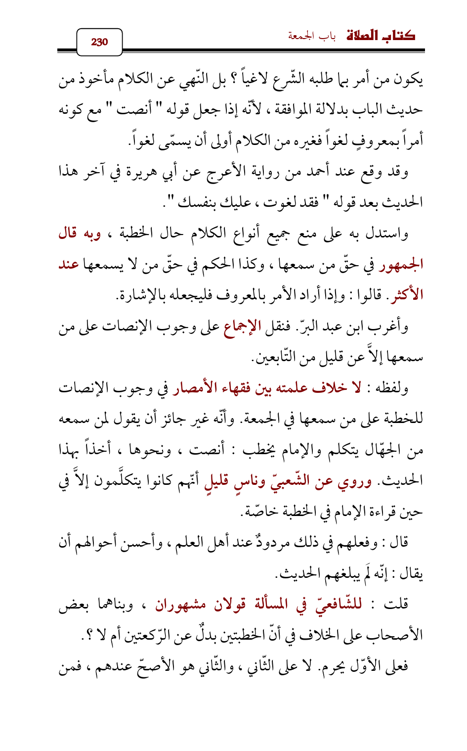ولفظه: لا خلاف علمته بين فقهاء الأمصار في وجوب الإنصات للخطبة على من سمعها في الجمعة. وأنّه غير جائز أن يقول لمن سمعه من الجهّال يتكلم والإمام يخطب: أنصت، ونحوها، أخذاً بهذا الحديث. وروي عن الشّعبيّ وناسٍ قليلٍ أنّهم كانوا يتكلَّمون إلاَّ في حين قراءة الإمام في الخطبة خاصّة.
