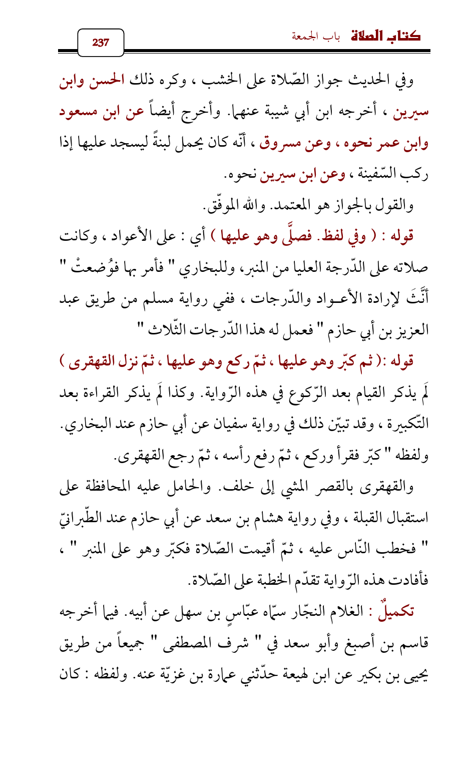 وفي الحديث جواز الصّلاة على الخشب، وكره ذلك الحسن وابن سيرين، أخرجه ابن أبي شيبة عنهما. وأخرج أيضاً عن ابن مسعود وابن عمر نحوه , وعن مسروق , أنّه كان يحمل لبنةً ليسجد عليها إذا ركب السّفينة، وعن ابن سيرين نحوه.