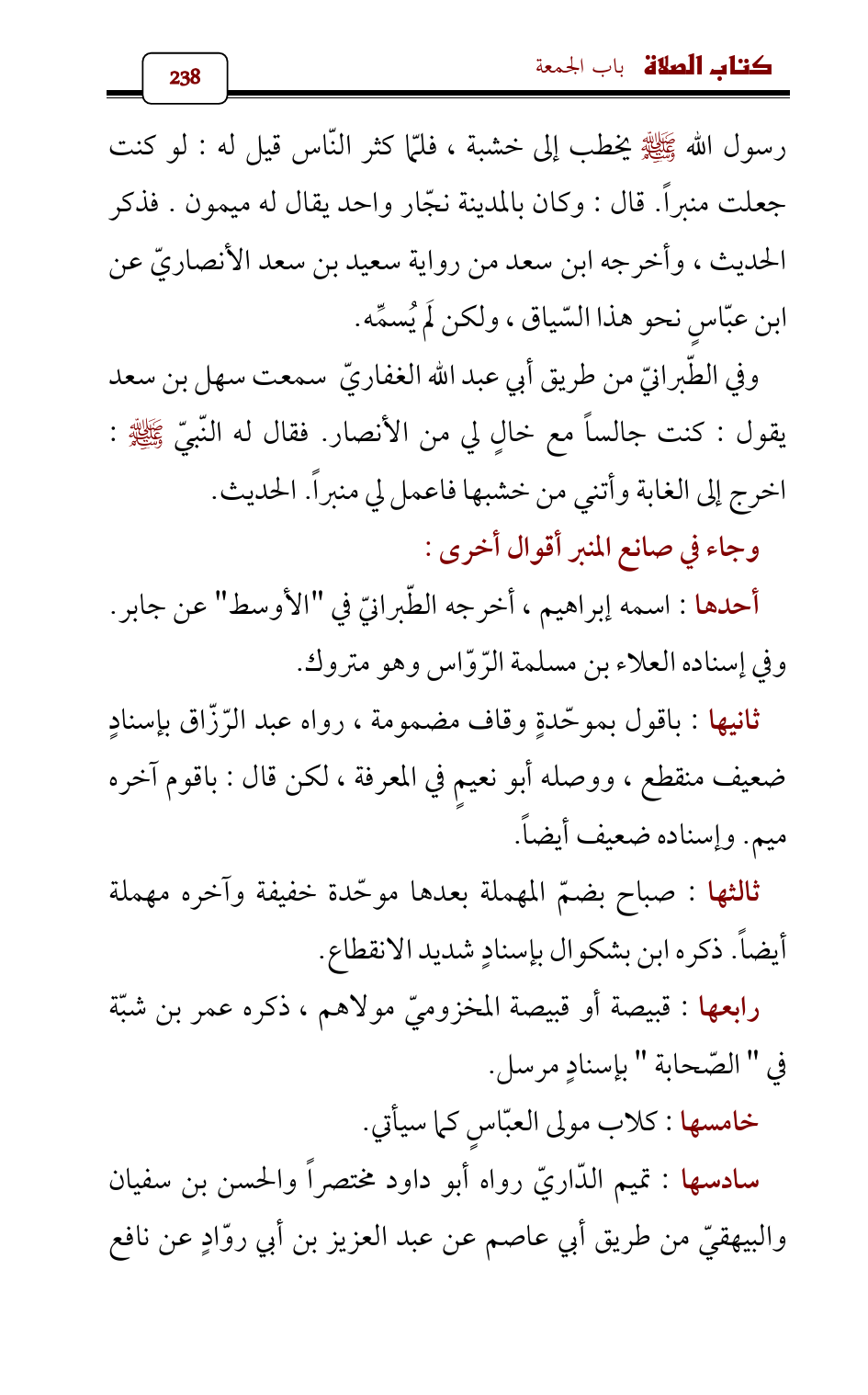 رسول الله - صلى الله عليه وسلم - يخطب إلى خشبة، فلمّا كثر النّاس قيل له: لو كنت جعلت منبراً. قال: وكان بالمدينة نجّار واحد يقال له ميمون. فذكر الحديث، وأخرجه ابن سعد من رواية سعيد بن سعد الأنصاريّ عن ابن عبّاسٍ نحو هذا السّياق , ولكن لَم يُسمِّه.