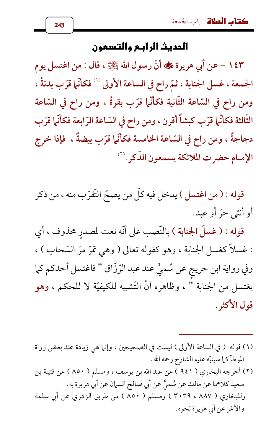 143 - عن أبي هريرة - رضي الله عنه - أنّ رسول الله - صلى الله عليه وسلم - , قال: من اغتسل يوم الجمعة , غسل الجنابة , ثمّ راح في الساعة الأولى (¬1) فكأنّما قرّب بدنةً , ومن راح في السّاعة الثّانية فكأنّما قرّب بقرةً , ومن راح في السّاعة الثّالثة فكأنّما قرّب كبشاً أقرن , ومن راح في السّاعة الرّابعة فكأنّما قرّب دجاجةً , ومن راح في السّاعة الخامسة فكأنّما قرّب بيضةً , فإذا خرج الإمام حضرت الملائكة يسمعون الذّكر. (¬2)