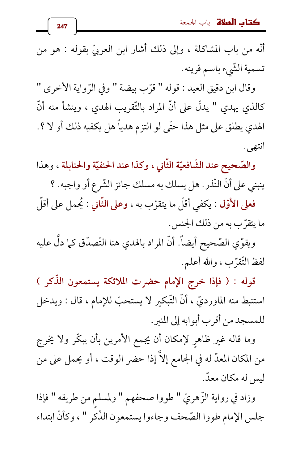 وقال ابن دقيق العيد: قوله " قرّب بيضة " وفي الرّواية الأخرى " كالذي يهدي " يدلّ على أنّ المراد بالتّقريب الهدي، وينشأ منه أنّ الهدي يطلق على مثل هذا حتّى لو التزم هدياً هل يكفيه ذلك أو لا؟. انتهى.