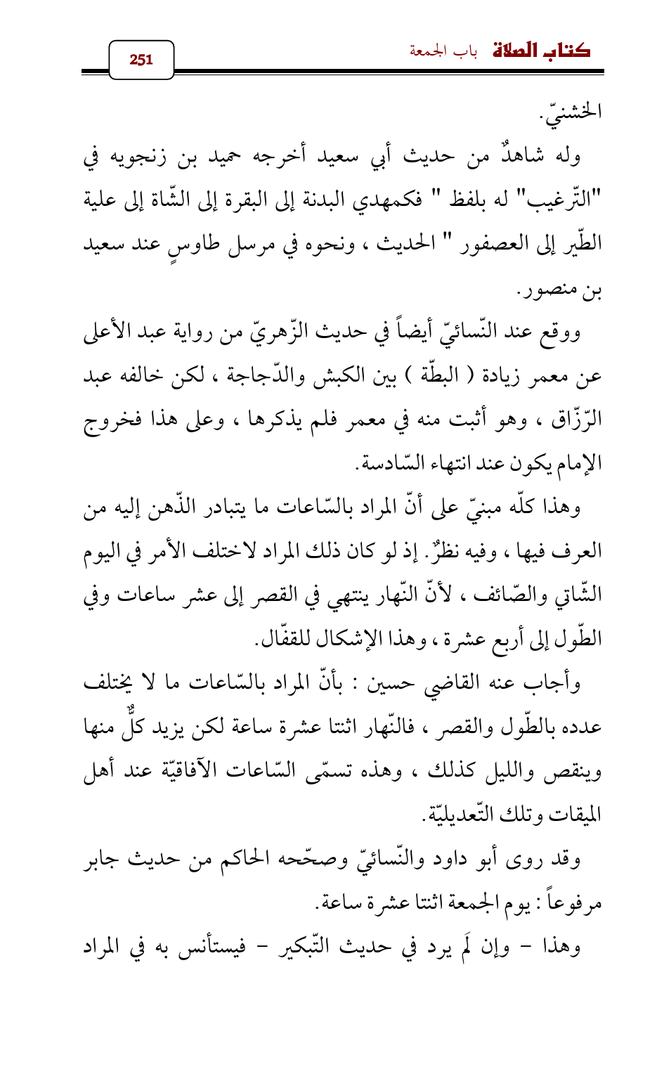 وقد روى أبو داود والنّسائيّ وصحّحه الحاكم من حديث جابر مرفوعاً: يوم الجمعة اثنتا عشرة ساعة.