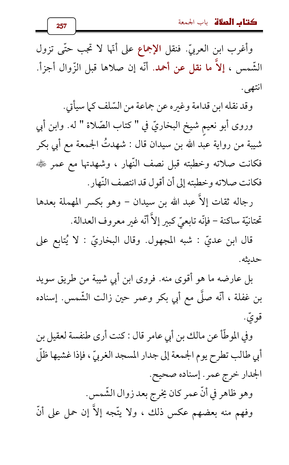 وروى أبو نعيمٍ شيخ البخاريّ في " كتاب الصّلاة " له. وابن أبي شيبة من رواية عبد الله بن سيدان قال: شهدتُ الجمعة مع أبي بكر فكانت صلاته وخطبته قبل نصف النّهار، وشهدتها مع عمر - رضي الله عنه - فكانت صلاته وخطبته إلى أن أقول قد انتصف النّهار.