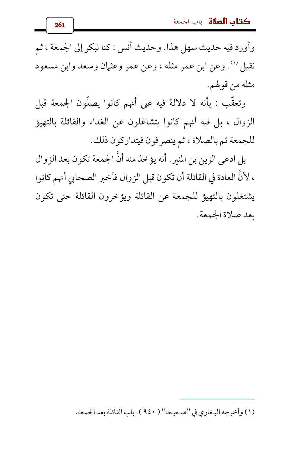 بل ادعى الزين بن المنير. أنه يؤخذ منه أنَّ الجمعة تكون بعد الزوال , لأنَّ العادة في القائلة أن تكون قبل الزوال فأخبر الصحابي أنهم كانوا يشتغلون بالتهيؤ للجمعة عن القائلة ويؤخرون القائلة حتى تكون بعد صلاة الجمعة.