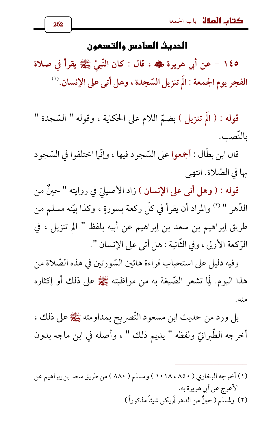 145 - عن أبي هريرة - رضي الله عنه - , قال: كان النّبيّ - صلى الله عليه وسلم - يقرأ في صلاة الفجر يوم الجمعة: الَم تنزيل السّجدة , وهل أتى على الإنسان. (¬1)