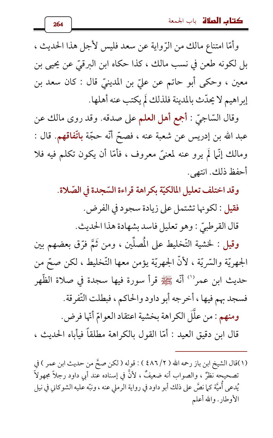 وقيل: لخشية التّخليط على المُصلِّين، ومن ثَمَّ فرّق بعضهم بين الجهريّة والسّريّة , لأنّ الجهريّة يؤمن معها التّخليط، لكن صحّ من حديث ابن عمر (¬1) أنّه - صلى الله عليه وسلم - قرأ سورة فيها سجدة في صلاة الظّهر فسجد بهم فيها، أخرجه أبو داود والحاكم، فبطلت التّفرقة.