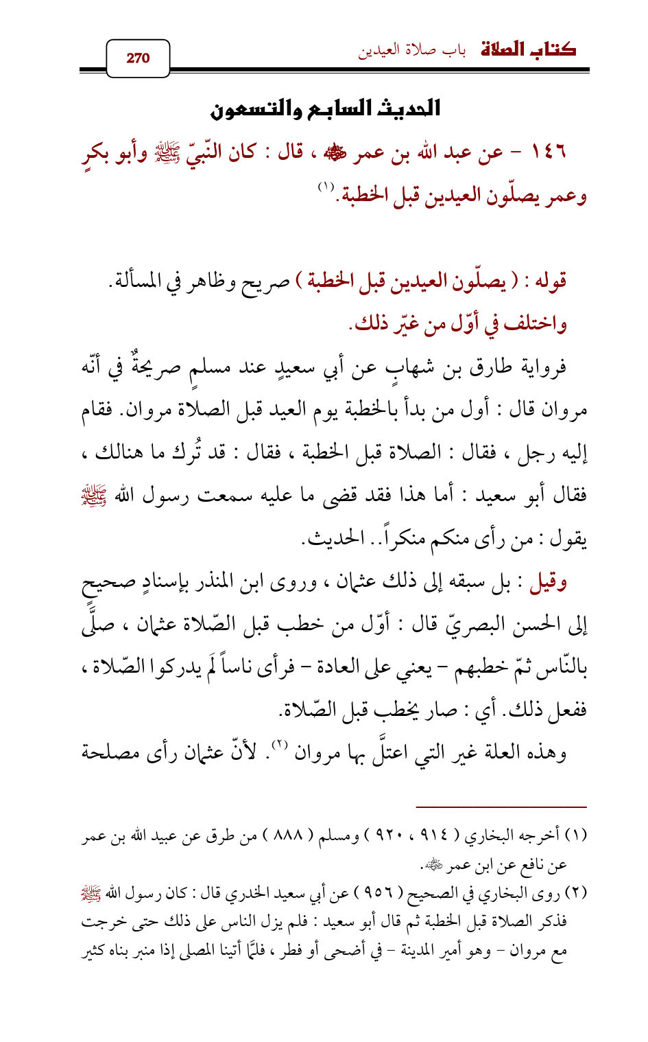 146 - عن عبد الله بن عمر - رضي الله عنه - , قال: كان النّبيّ - صلى الله عليه وسلم - وأبو بكرٍ وعمر يصلّون العيدين قبل الخطبة. (¬1)
