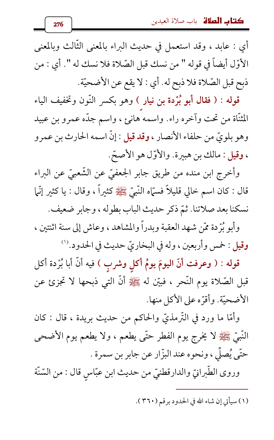قوله: (فقال أبو بُرْدة بن نيار) وهو بكسر النّون وتخفيف الياء المثنّاة من تحت وآخره راء. واسمه هانئ , واسم جدّه عمرو بن عبيد وهو بلويّ من حلفاء الأنصار، وقد قيل: إنّ اسمه الحارث بن عمرو , وقيل: مالك بن هبيرة. والأوّل هو الأصحّ.