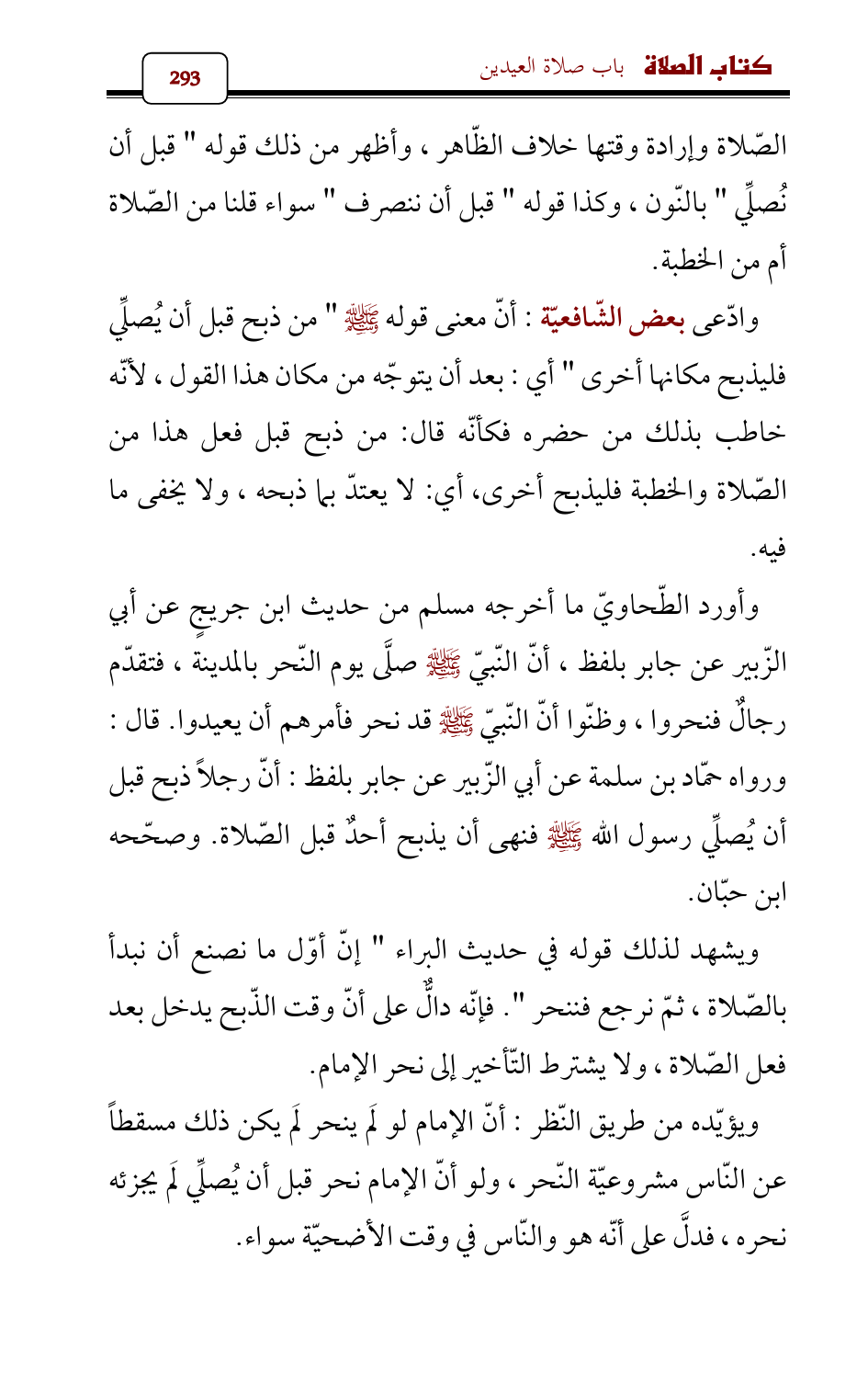 ويشهد لذلك قوله في حديث البراء " إنّ أوّل ما نصنع أن نبدأ بالصّلاة، ثمّ نرجع فننحر ". فإنّه دالٌّ على أنّ وقت الذّبح يدخل بعد فعل الصّلاة، ولا يشترط التّأخير إلى نحر الإمام.