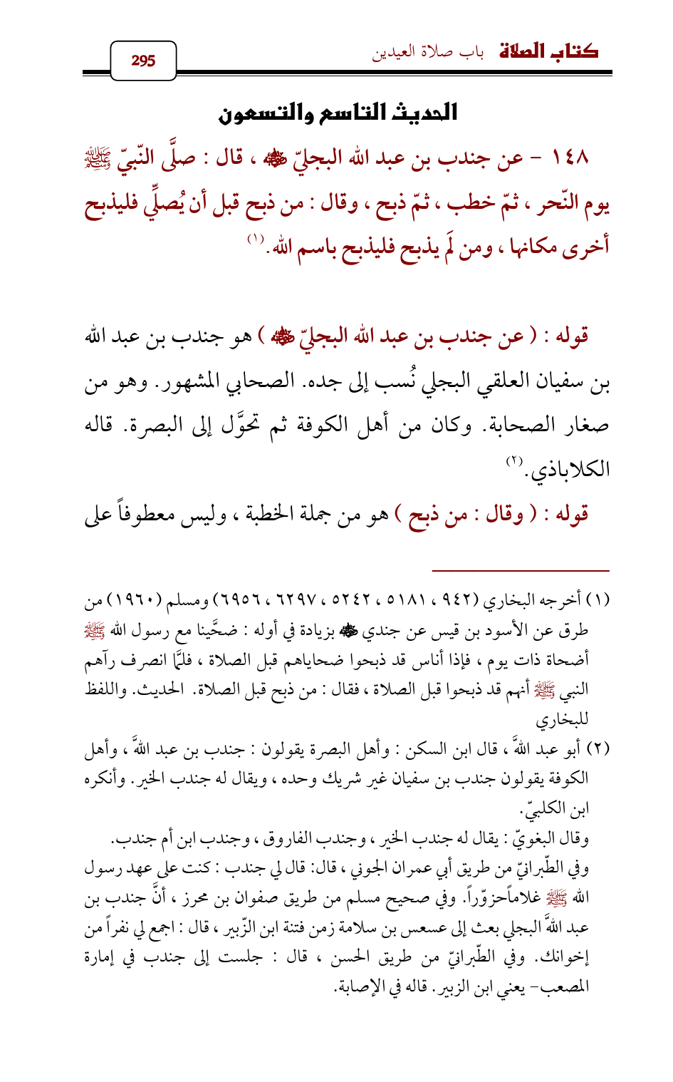 148 - عن جندب بن عبد الله البجليّ - رضي الله عنه - , قال: صلَّى النّبيّ - صلى الله عليه وسلم - يوم النّحر , ثمّ خطب , ثمّ ذبح , وقال: من ذبح قبل أن يُصلِّي فليذبح أخرى مكانها , ومن لَم يذبح فليذبح باسم الله. (¬1)