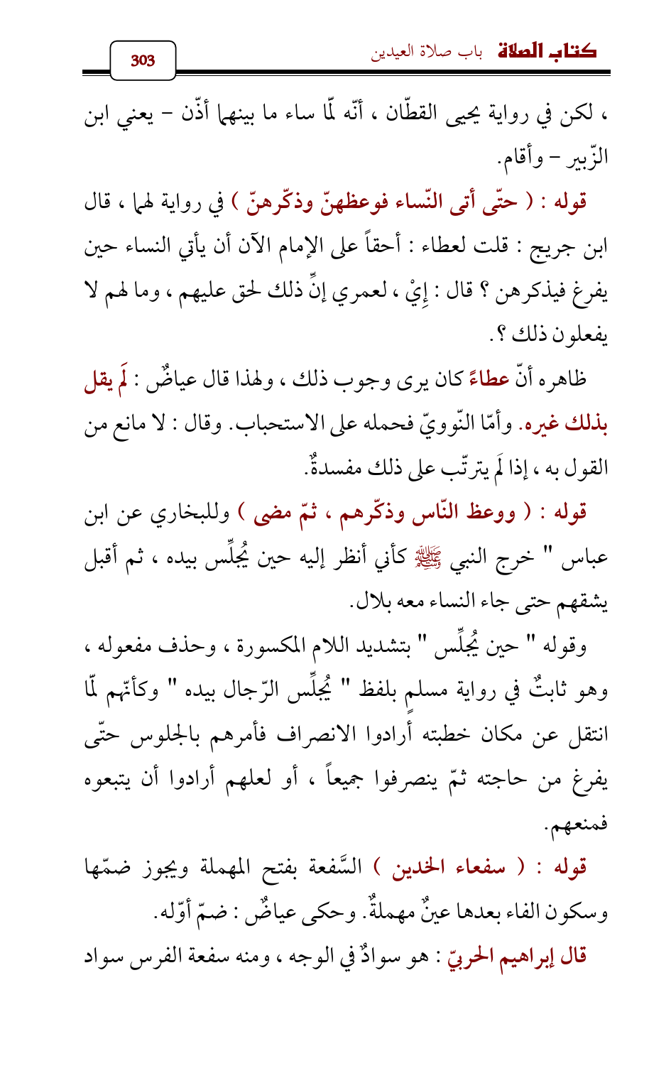 قوله: (حتّى أتى النّساء فوعظهنّ وذكّرهنّ) في رواية لهما , قال ابن جريج: قلت لعطاء: أحقاً على الإمام الآن أن يأتي النساء حين يفرغ فيذكرهن؟ قال: إِيْ، لعمري إنِّ ذلك لحق عليهم، وما لهم لا يفعلون ذلك؟.