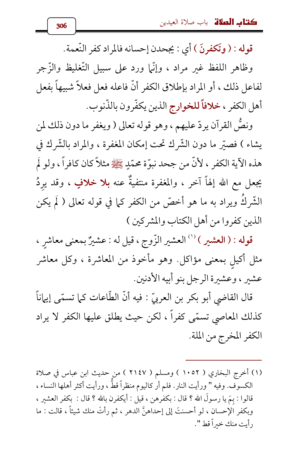 وظاهر اللفظ غير مراد , وإنّما ورد على سبيل التّغليظ والزّجر لفاعل ذلك، أو المراد بإطلاق الكفر أنّ فاعله فعل فعلاً شبيهاً بفعل أهل الكفر , خلافاً للخوارج الذين يكفّرون بالذّنوب.
