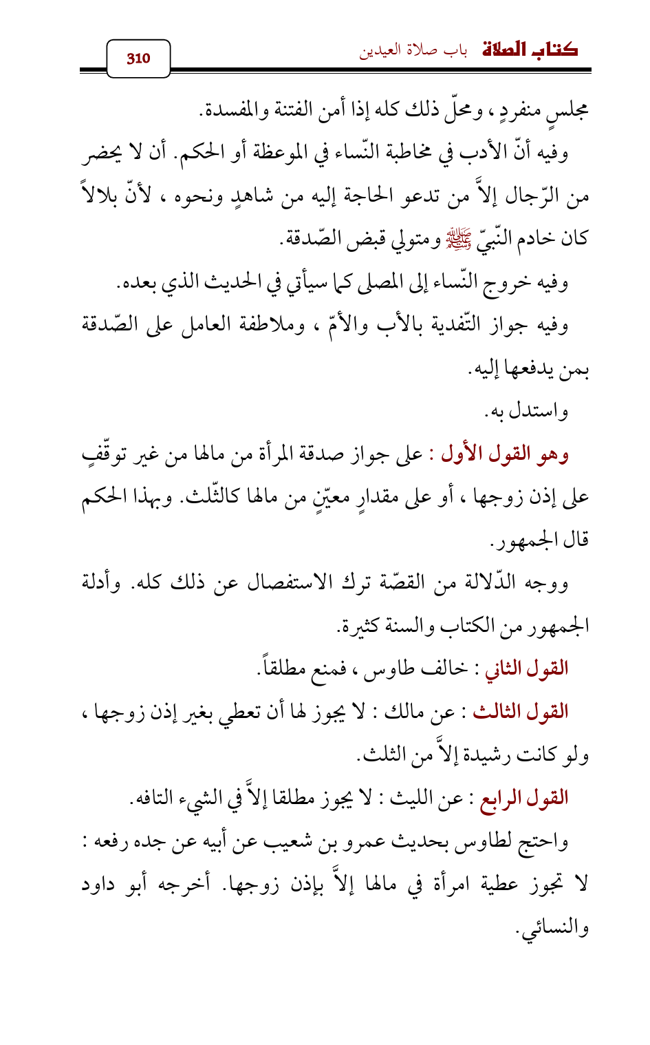 واحتج لطاوس بحديث عمرو بن شعيب عن أبيه عن جده رفعه: لا تجوز عطية امرأة في مالها إلاَّ بإذن زوجها. أخرجه أبو داود والنسائي.