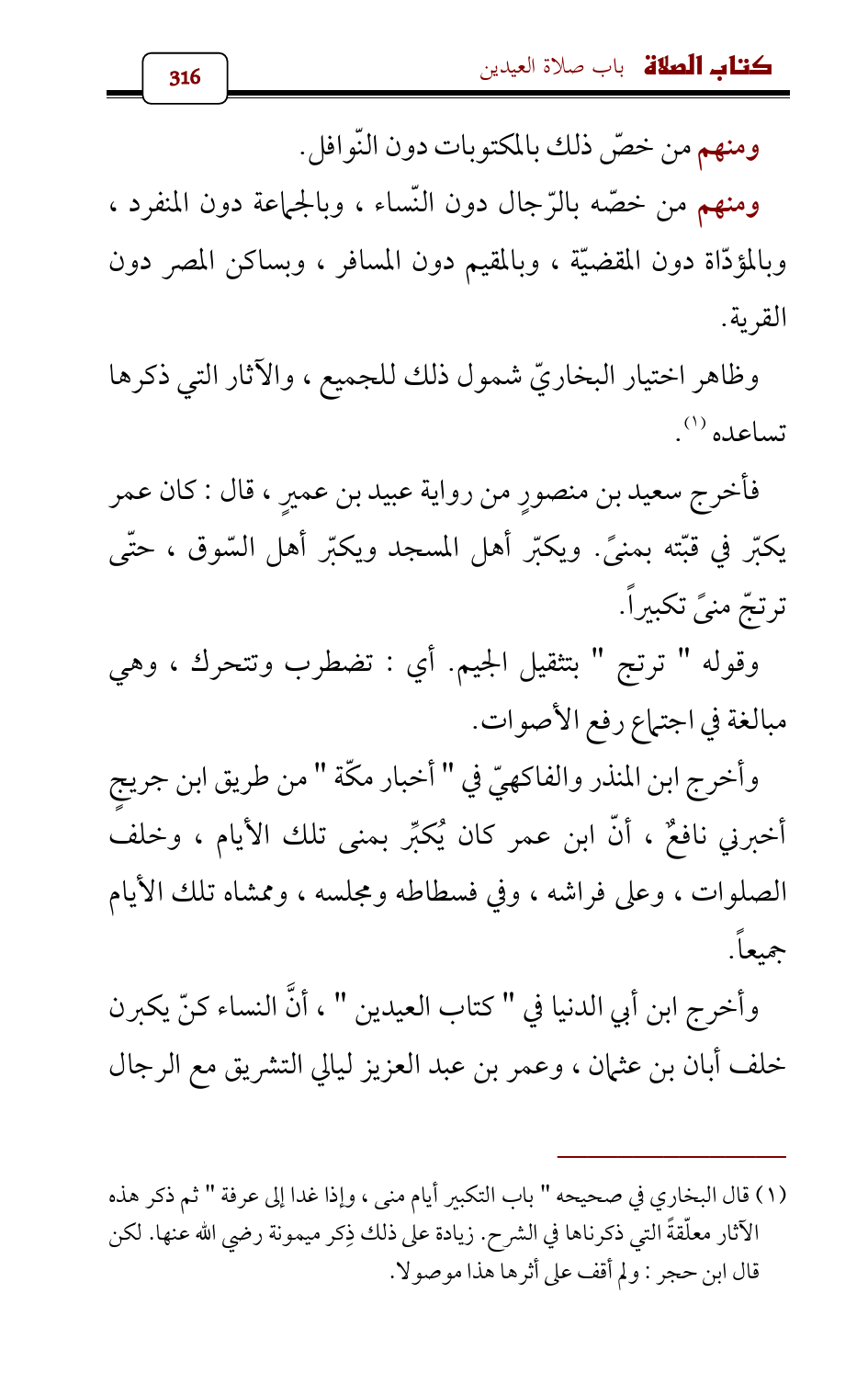 (¬1) قال البخاري في صحيحه " باب التكبير أيام منى , وإذا غدا إلى عرفة " ثم ذكر هذه الآثار معلّقةً التي ذكرناها في الشرح. زيادة على ذلك ذِكر ميمونة رضي الله عنها. لكن قال ابن حجر: ولم أقف على أثرها هذا موصولا.
