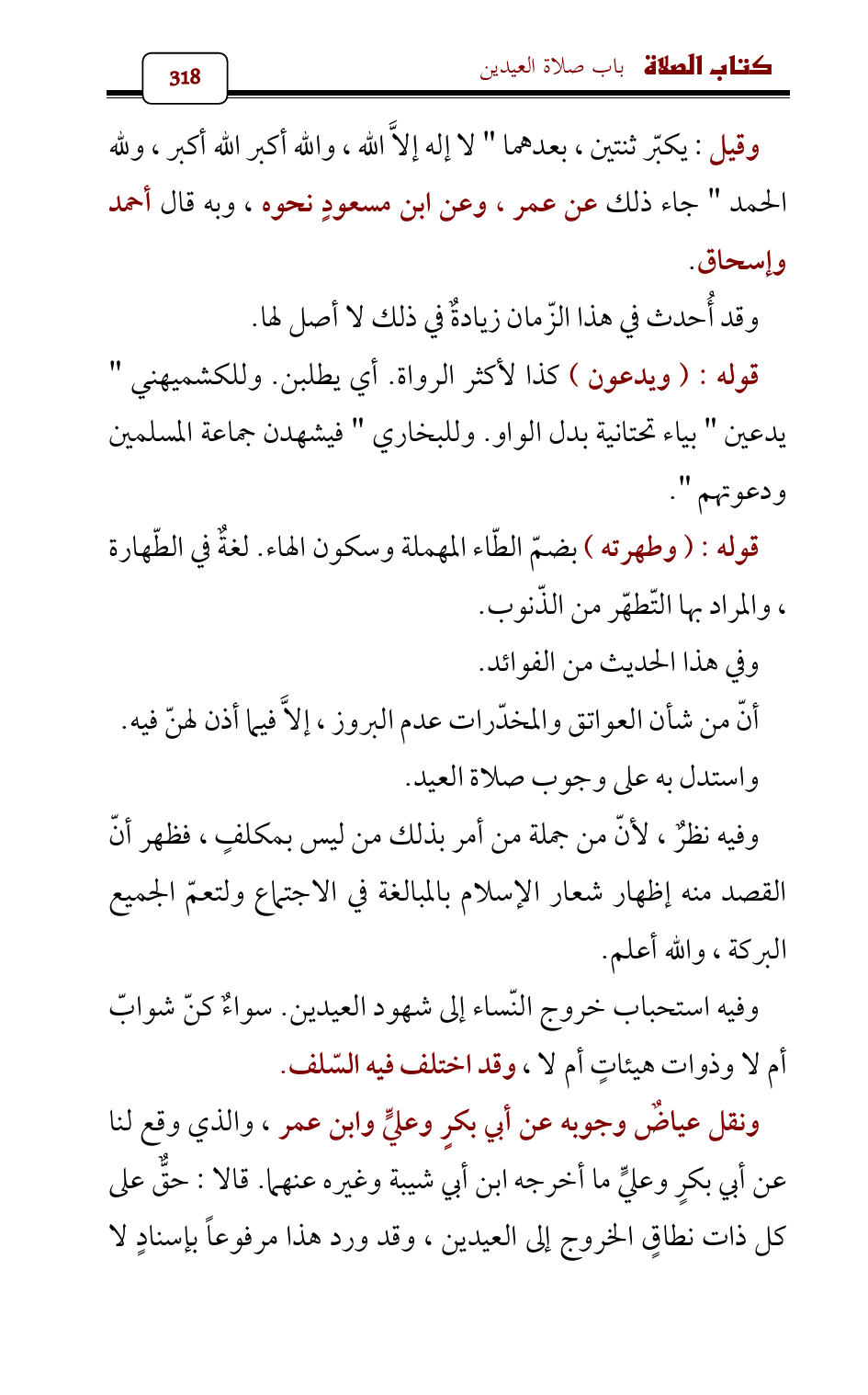 ونقل عياضٌ وجوبه عن أبي بكرٍ وعليٍّ وابن عمر، والذي وقع لنا عن أبي بكرٍ وعليٍّ ما أخرجه ابن أبي شيبة وغيره عنهما. قالا: حقٌّ على كل ذات نطاقٍ الخروج إلى العيدين , وقد ورد هذا مرفوعاً بإسنادٍ لا