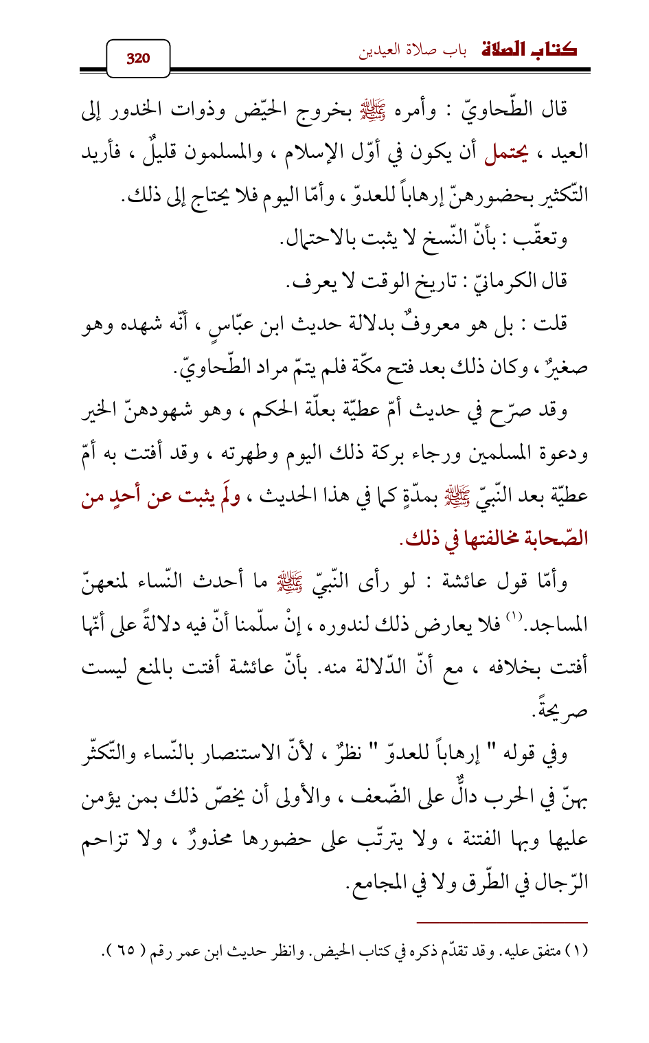 قال الطّحاويّ: وأمره - صلى الله عليه وسلم - بخروج الحيّض وذوات الخدور إلى العيد , يحتمل أن يكون في أوّل الإسلام , والمسلمون قليلٌ , فأريد التّكثير بحضورهنّ إرهاباً للعدوّ، وأمّا اليوم فلا يحتاج إلى ذلك.