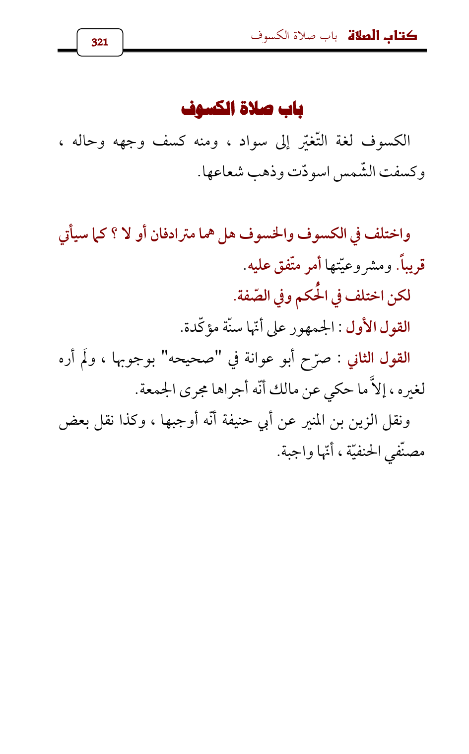 واختلف في الكسوف والخسوف هل هما مترادفان أو لا؟ كما سيأتي قريباً. ومشروعيّتها أمر متّفق عليه.
