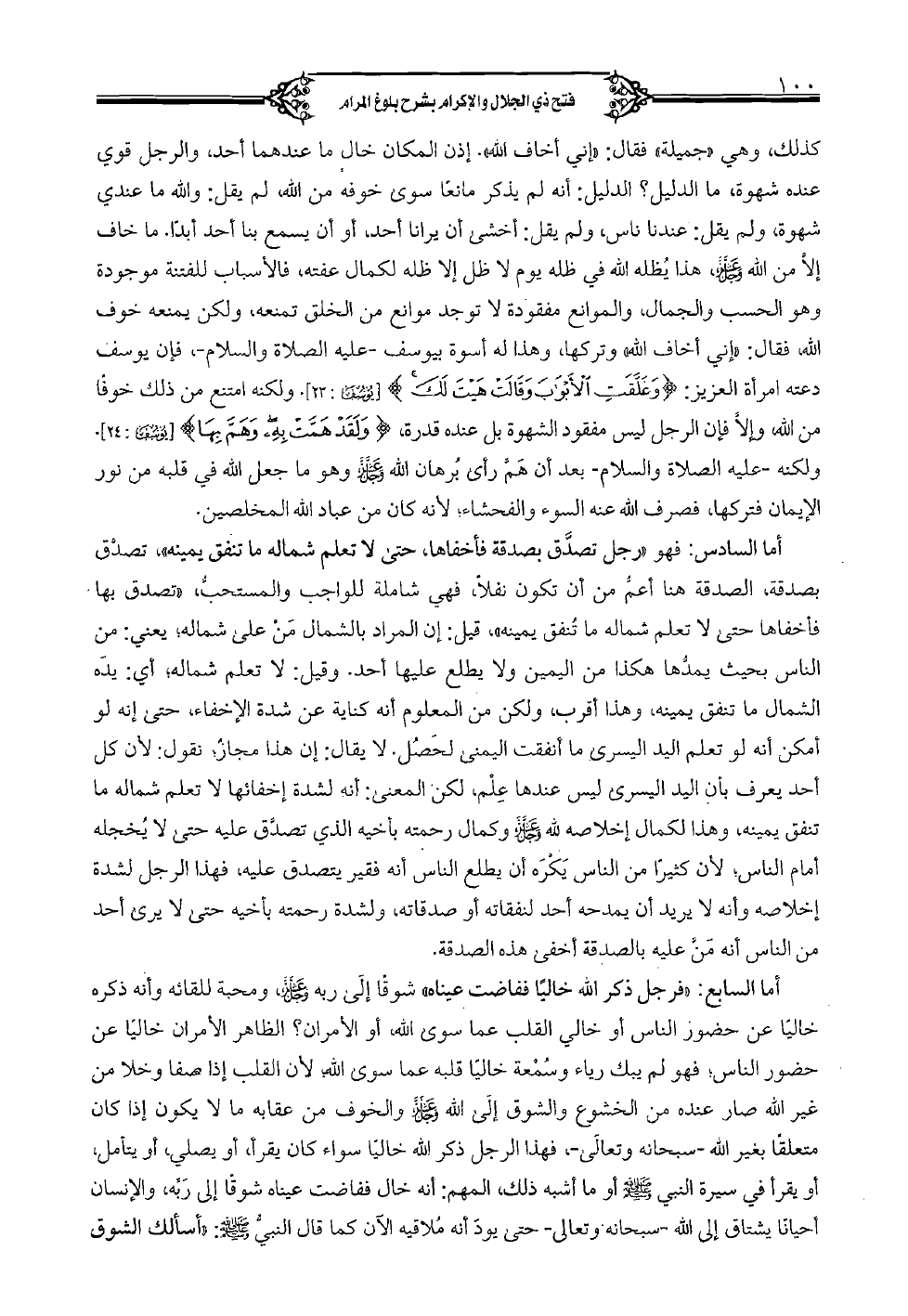 أما السابع: "فرجل ذكر الله خاليًا ففاضت عيناه" شوقًا إلى ربه عز وجل، ومحبة للقائه وأنه ذكره خاليا عن حضور الناس أو خالي القلب عما سوى الله، أو الأمران؟ الظاهر الأمران خاليا عن حضور الناس؛ فهو لم يبك رياء وملمعة خاليا قلبه عما سوى الله لأن القلب إذا صفا وخلا من غير الله صار عنده من الخشوع والشوق إلى الله عز وجل والخوف من عقابه ما لا يكون إذا كان متعلقا بغير الله- سبحانه وتعالى-، فهذا الرجل ذكر الله خاليًا سواء كان يقرأ، أو يصلي، أو يتأمل، أو يقرأ في سيرة النبي صلى الله عليه وسلم أو ما أشبه ذلك، المهم: أنه خال ففاضت عيناه شوقًا إلى ربّه، والإنسان أحيانًا يشتاق إلى الله- سبحانه وتعالى- حتى يود أنه ملاقيه الآن كما قال النبي صلى الله عليه وسلم: "أسألك الشوق