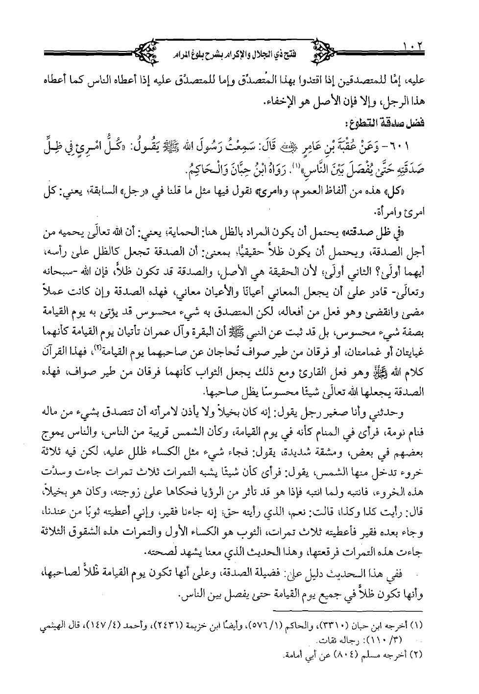 601 - وعن عقبة بن عامرٍ رضي الله عنه قال: سمعت رسول الله صلى الله عليه وسلم يقول: "كلُّ امرئٍ في ظلِّ صدقته حتَّى يفصل بين النَّاس". رواه ابن حبان والحاكم.