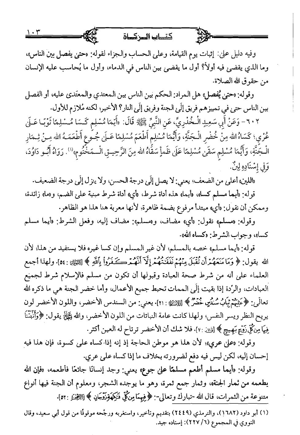 قوله: "أيما مسلم" خصه بالمسلم؛ لأن غير المسلم وإن كسا غيره فلا يستفيد من هذا؛ لأن الله يقول: {وما منعهمّ أن تقبل منهم نفقاتهم إلا أنهم كفروا بالله} [التوبة: 54]. ولهذا أجمع العلماء على أنه من شرط صحة العبادة وقبولها أن تكون من مسلم فالإسلام شرط لجميع العبادات، والردة إذا بقيت إلى الممات تحبط جميع الأعمال، وأما خضر الجنة هي ما ذكره الله تعالى: {عليهم ثياب سندسٍ خضرٌ} [الإنسان: 21]. يعني: من السندس الأخضر، واللون الأخضر لون يريح النظر ويسر النفس؛ ولهذا كانت عامة النباتات من اللون الأخضر، والله عز وجل يقول: {وأنبتنا فيها من كل زوج بهيج} [ق: 7]. فلا شك إن الأخضر ترتاح له العين أكثر.