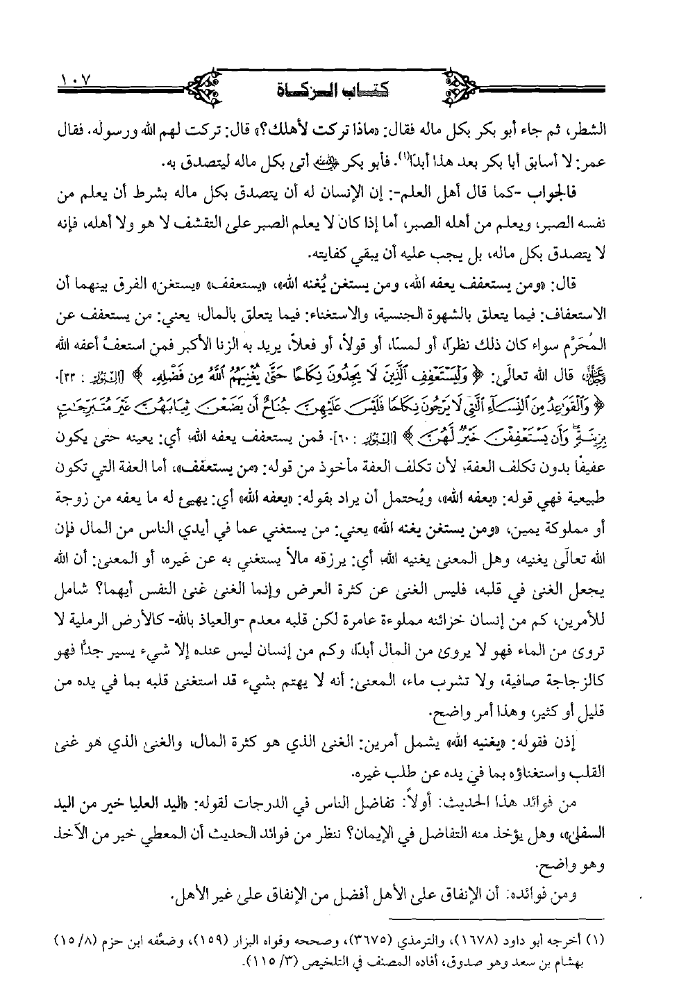قال: "ومن يستعفف يعفه الله، ومن يستغن يغنه الله"، "يستعفف" "يستغن" الفرق بينهما أن الاستعفاف: فيما يتعلق بالشهوة الجنسية، والاستغناء: فيما يتعلق بالمال؛ يعنى: من يستعفف عن المحرم سواء كان ذلك نظرًا أو لمسًا، أو قولًا، أو فعلًا، يريد به الزنا الأكبر فمن استعف أعفه الله عز وجل، قال الله تعالى: {وليستعفف الذين لا يجدون نكاحًا حتى يغنيهم الله من فضلة} [النور: 33]. {والقواعد من النساء التي لا يرجون نكاحًا فليس عليهم جناح أن يضعن ثيابهن غير متبرجات بزينة وأن يستعففن خير لهن} [النور: 60]. فمن يستعفف يعفه الله أي: يعينه حتى يكون عفيفًا بدون تكلف العفة؛ لأن تكلف العفة مأخوذ من قوله: "من يستعفف"، أما العفة التي تكون طبيعية فهي قوله: "يعفه الله"، ويحتمل أن يراد بقوله: "يعفه الله" أي: يهيئ له ما يعفه من زوجة أو مملوكة يمين، "ومن يستغن يغنه الله" يعني: من يستغني عما في أيدي الناس من المال فإن الله تعالى يغنيه، وهل المعنى يغنيه الله أي: يرزقه كالًا يستغني به عن غيره أو المعنى: أن الله يجعل الغنى في قلبه، فليس الغنى عن كثرة العرض وإنما الغنى غنى النفس أيهما؟ شامل للأمرين، كم من إنسان خزائنه مملوءة عامرة لكن قلبه معدم- والعياذ بالله- كالأرض الرملية لا تروى من الماء فهو لا يروى من المال أبدًا، وكم من إنسان ليس عنده إلا شيء يسير جدًا فهو كالزجاجة صافية، ولا تشرب ماء، المعني: أنه لا يهتم بشيء قد استغنى قلبه بما في يده من قليل أو كثير، وهذا أمر واضح.