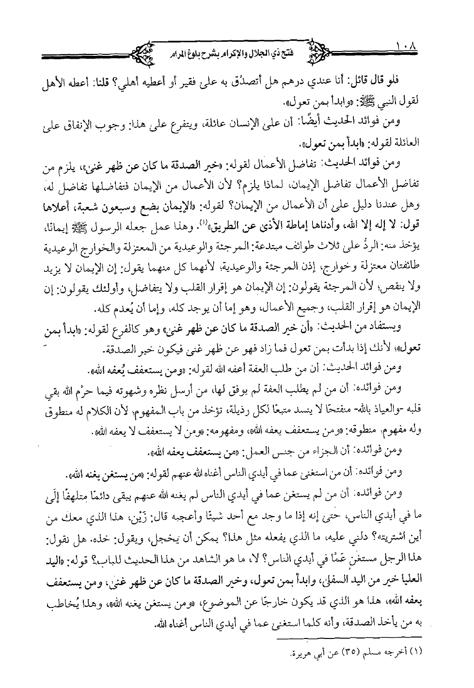 ومن فوائد الحديث: تفاضل الأعمال لقوله: "خير الصدقة ما كان عن ظهر غنى"، يلزم من تفاضل الأعمال تفاضل الإيمان، لماذا يلزم؟ لأن الأعمال من الإيمان فتفاضلها تفاضل له، وهل عندنا دليل على أن الأعمال من الإيمان؟ لقوله: "الإيمان بضع وسبعون شعبة، أعلاها قول: لا إله إلا الله، وأدناها إماطة الأذى عن الطريق"، وهذا عمل جعله الرسول صلى الله عليه وسلم إيمانًا، يؤخذ منها: الرد على ثلاث طوائف مبتدعة: المرجئة والوعيدية من المعتزلة والخوارج الوعيدية طائفتان معتزلة وخوارج، إذن المرجئة والوعيدية؛ لأنهما كل منهما يقول: إن الإيمان لا يزيد ولا ينقص؛ لأن المرجئة يقولون: إن الإيمان هو إقرار القلب ولا يتفاضل، وأولئك يقولون: إن الإيمان هو إقرار القلب، وجميع الأعمال، وهو إما أن يوجد كله، وإما أن يعدم كله.