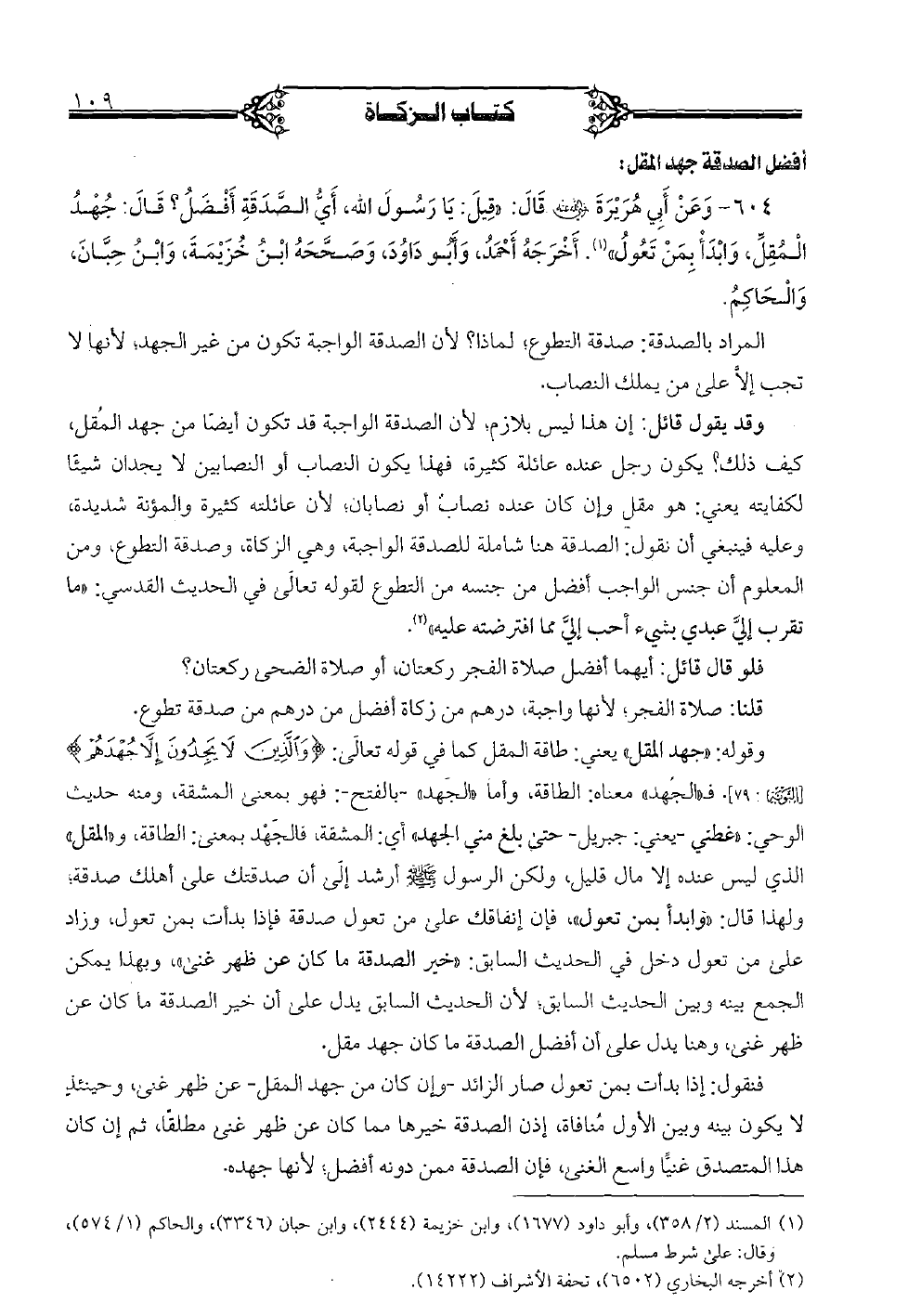 604 - وعن أبي هريرة رضي الله عنه قال: "قيل: يا رسول الله، أيُّ الصَّدقةٍ أفضل؟ قال: المقلِّ، وابدأ بمن تعول". أخرجه أحمد، وأبو داود، وصحَّحه ابن خزيمة، واين جان، والحاكم.