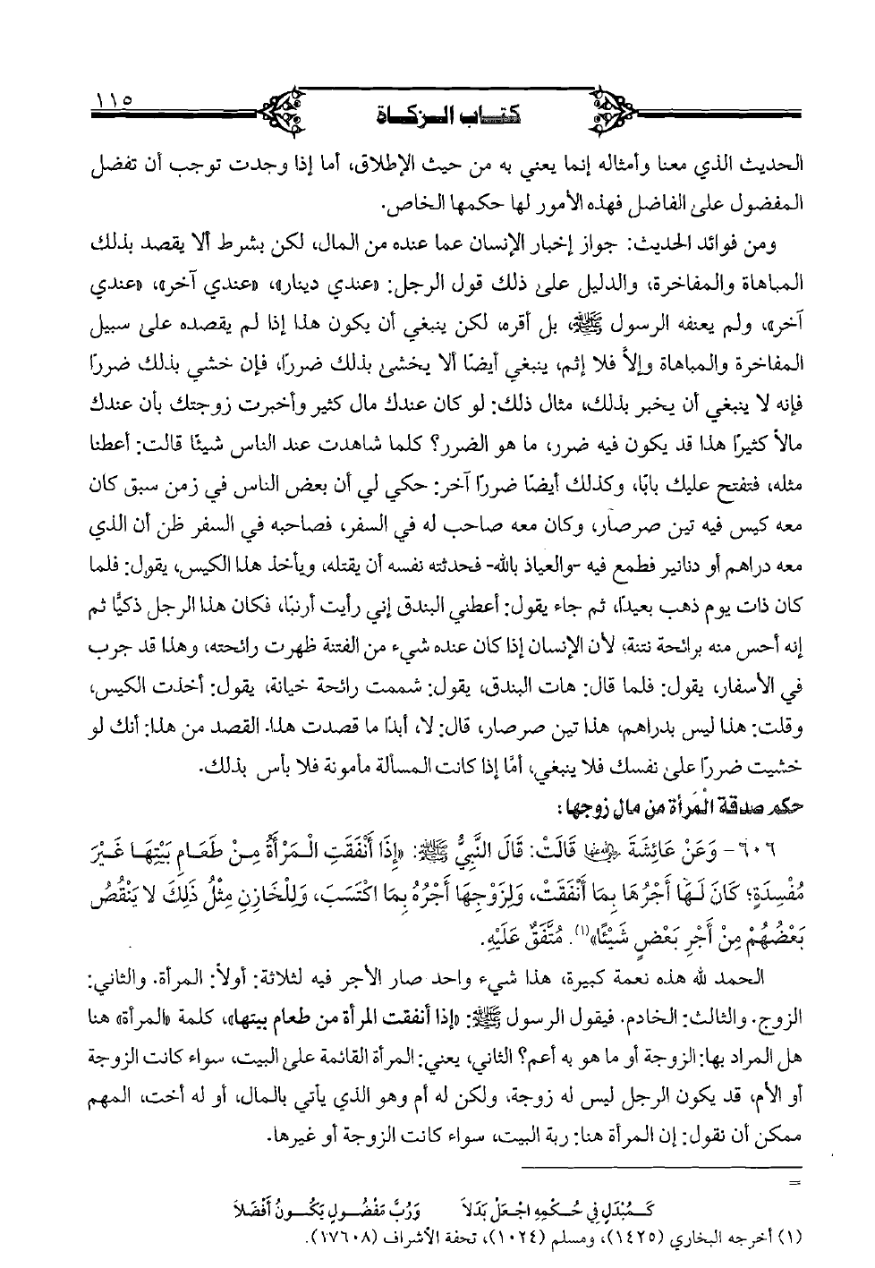 ومن فوائد الحديث: جواز إخبار الإنسان عما عنده من المال، لكن بشرط ألا يقصد بذلك المباهاة والمفاخرة، والدليل على ذلك قول الرجل: "عندي دينار" "عتدي آخر"، "عندي آخر"، ولم يعنفه الرسول صلى الله عليه وسلم بل أقره، لكن ينبغي أن يكون هذا إذا لم يقصده على سبيل المفاخرة والمباهاة وإلا فلا إثم، ينبغي أيضًا ألا يخشى بذلك ضررًا، فإن خشي بذلك ضررًا فإنه لا ينبغي أن يخبر بذلك، مثال ذلك: لو كان عندك مال كثير وأخبرت زوجتك بأن عندك ملًا كبيرًا هذا قد يكون فيه ضرر، ما هو الضرر؟ كلما شاهدت عند الناس شيئًا قالت: أعطا مثله، فتفتح عليك بابًا، وكذلك أيضًا ضررًا آخر: حكي لي أن بعض الناس في زمن سبق كان معه كيس فيه تين صرصار، وكان معه صاحب له في السفر، فصاحبه في السفر ظن أن الذي معه دراهم أو دنانير فطمع فيه- والعياذ بالله- فحدثته نفسه أن يقتله، ويأخذ هذا الكيس، يقول: فلما كان ذات يوم ذهب بعيدًا، ثم جاء يقول: أعطني البندق إني رأيت أرنبًا، فكان هذا الرجل ذكيًّا ثم إنه أحس منه برائحة نتنة؛ لأن الإنسان إذا كان عنده شيء من الفتنة ظهرت رائحته، وهذا قد جرب في الأسفار، يقول: فلما قال: هات البندق، يقول: شممت رائحة خيانة، يقول: أخذت الكيس، وقلت: هنا ليس بدراهم هذا تين صرصار، قال: لا، أبدًا ما قصدت هذا. القصد من هذا: أنك لو خشيت ضررًا على نفسك فلا ينبغي، أمَّا إذا كانت المسألة مأمونة فلا بأس بذلك.