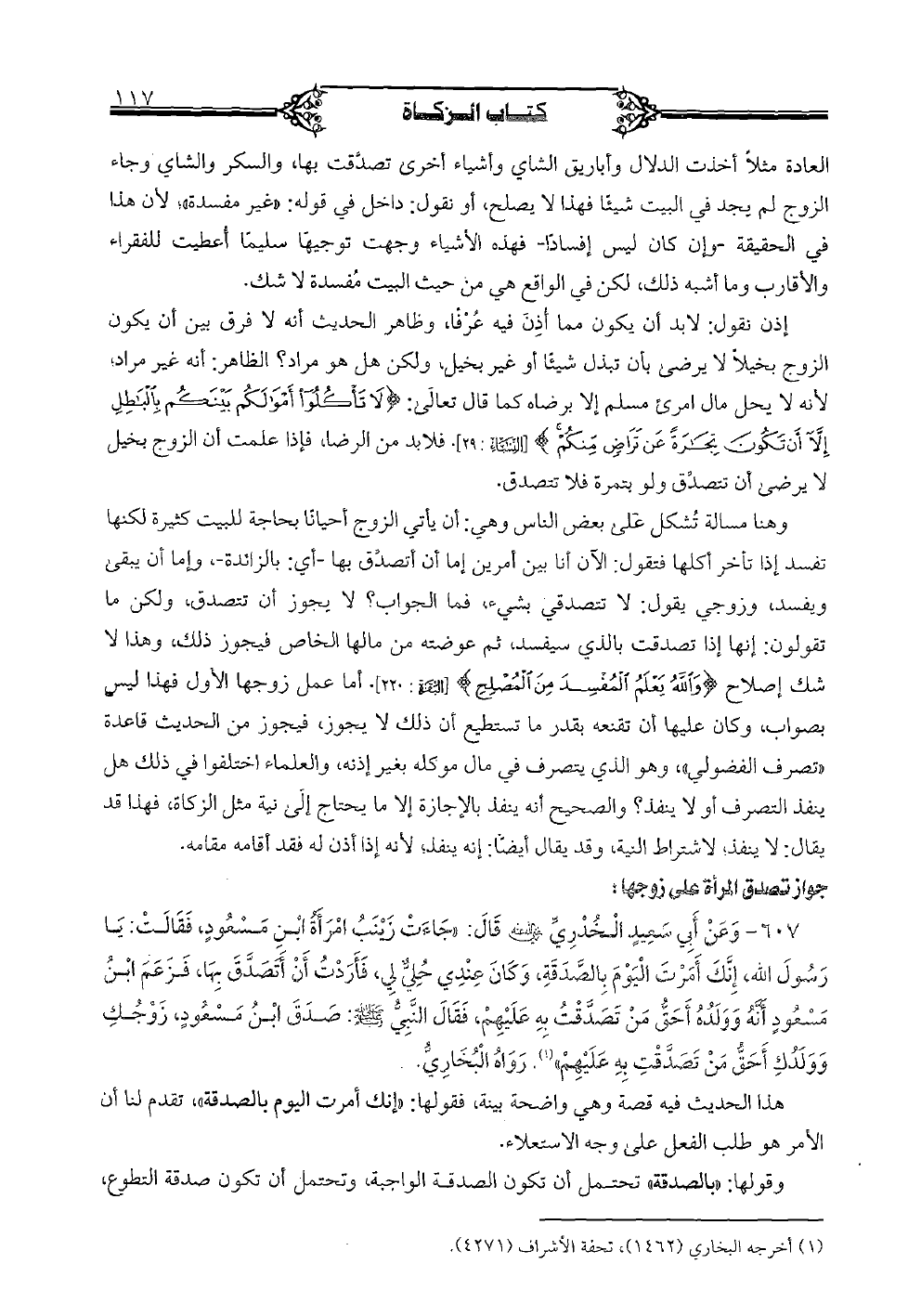 وهنا مسالة تشكل على بعض الناس وهي: أن يأتي الزوج أحيانًا بحاجة للبيت كثيرة لكنها تفسد إذا تأخر أكلها فتقول: الآن أنا بين أمرين إما أن أتصدِّق بها- أي: بالزائدة-، وإما أن يبقى ويفسد، وزوجي يقول: لا تتصدقي بشيء، فما الجواب؟ لا يجوز أن تتصدق، ولكن ما تقولون: إنها إذا تصدقت بالذي سيفسد، ثم عوضته من مالها الخاص فيجوز ذلك، وهذا لا شك إصلاح {والله يعلم المفسد من المصلح} [البقرة: 220]. أما عمل زوجها الأول فهذا ليس بصواب، وكان عليها أن تقنعه بقدر ما تستطيع أن ذلك لا يجوز، فيجوز من الحديث قاعدة "تصرف الفضولي"، وهو الذي يتصرف في مال موكله بغير إذنه، والعلماء اختلفوا في ذلك هل ينفذ التصرف أو لا ينفذ؟ والصحيح أنه ينفذ بالإجازة إلا ما يحتاج إلى نية مثل الزكاة، فهذا قد يقال: لا ينفذ، لاشتراط النية، وقد يقال أيضًا: إنه ينفذ؛ لأنه إذا أذن له فقد أقامه مقامه.
