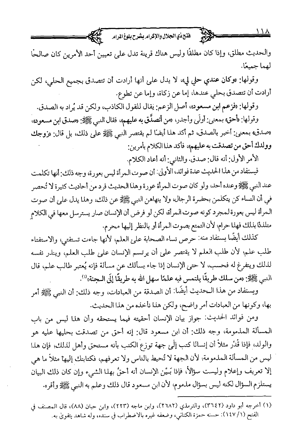 ومن فوائد الحديث: جواز بيان الإنسان أحقيته فيما يستحقه وأن هذا ليس من باب المسألة المذمومة، وجه ذلك: أن ابن مسعود قال: إنه أحق من تصدقت بحليها عليه هو والولد، فإذا قدِّر مثلًا أن إنسانًا كتب إلى جهة توزع الكتب بأنه مستحق وأهل لذلك؛ فإن هذا ليس من المسألة المذمومة؛ لأن الجهة لا تحيط بالناس ولا تعرفهم، فكتابتك إليها مثلًا ما هي إلا تعريف وإعلام وليست سؤالًا، فإذا بيَّن الإنسان أنه أحقَّ بهذا الشيء وإن كان ذلك البيان يستلزم السؤال لكنه ليس بسؤال مذموم؛ لأن ابن مسعود قال ذلك وعلم به النبي صلى الله عليه وسلم وأقره.