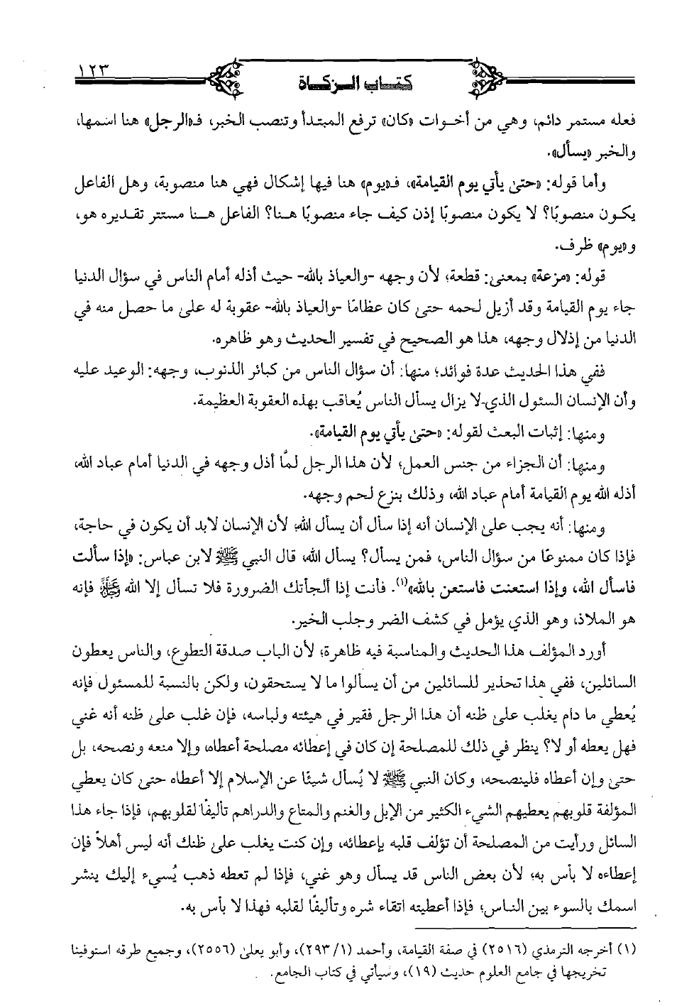 ففي هذا الحديث عدة فوائد؛ منها: أن سؤال الناس من كبائر الذنوب، وجهه: الوعيد عليه وأن الإنسان السئول الذي لا يزال يسأل الناس يعاقب بهذه العقوبة العظيمة.