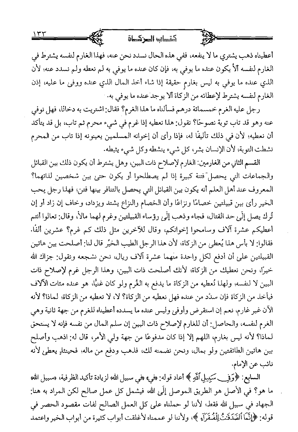 السابع: {وفي سبيل الله} أعاد قوله: "في" "في سبيل الله" لزيادة تأكيد الظرفية، "سبيل الله" ما هو؟ في الأصل هو الطريق الموصل إلى الله، فيشمل كل عمل صالح لكن المراد به هنا: الجهاد في سبيل الله فقط، لأننا لو حملناه على كل العمل الصالح لفات مقصود الحصر في قوله: {إنما الصدقات للفقراء}، ولأننا لو عممناه لأغلقت أبواب كثيرة من أبواب الخير واعتمد