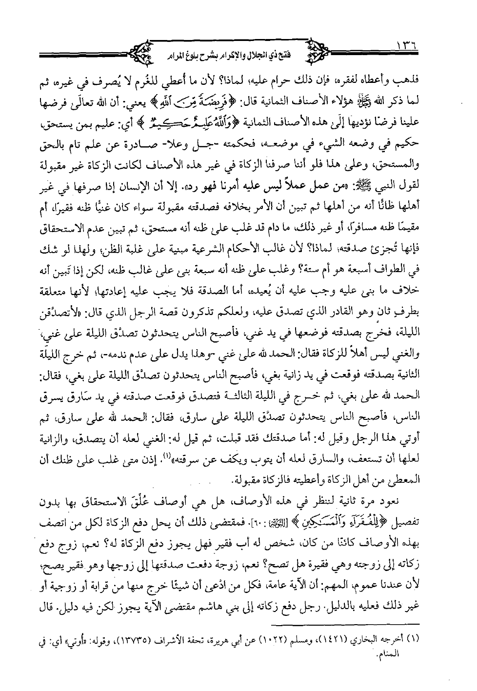 فذهب وأعطاه لفقره فإن ذلك حرام عليه، لماذا؟ لأن ما أعطي للغرام لا يصرف في غيره، ثم لما ذكر الله عزى وجل هؤلاء الأصناف الثمانية قال: {فريضة من الله} يعني: أن الله تعالى فرضها علينا فرضًا نؤديها إلى هذه الأصناف الثمانية {والله عليم حكيم} أي: عليم بمن يستحق، حكيم في وضعه الشيء في موضعه، فحكمته- جل وعلا- صادرة عن علم تام بالحق والمستحق، وعلى هذا فلو أننا صرفنا الزكاة في غير هذه الأصناف لكانت الزكاة غير مقبولة لقول النبي صلى الله عليه وسلم "من عمل عملًا ليس عليه أمرنا فهو رد"، إلا أن الإنسان إذا صرفها في غير أهلها ظانًّا أنه من أهلها ثم تبين أن الأمر بخلافه فصدقته مقبولة سواء كان غنيُّا ظنه فقيرًا، أم مقيمًا ظنه مسافرًا، أو غير ذلك، ما دام قد غلب على ظنه أنه مستحق، ثم تبين عدم الاستحقاق فإنها تجزئ صدقته؛ لماذا؟ لأن غالب الأحكام الشرعية مبنية على غلبة الظن؛ ولهذا لو شك في الطواف أسبعة هو أم ستة؟ وغلب على ظنه أنه سبعة بنى على غالب ظنه، لكن إذا تبين أنه خلاف ما بنى عليه وجب عليه أن يعيده، أما الصدقة فلا يجب عليه إعادتها؛ لأنها متعلقة بطرفٍ ثان وهو القادر الذي تصدق عليه، ولعلكم تذكرون قصة الرجل الذي قال: "لأتصدِّقن الليلة، فخرج بصدقته فوضعها في يد غني، فأصبح الناس يتحدثون تصدق الليلة على غني، والغني ليس أهلاً للزكاة فقال: الحمد لله على غني- وهذا يدل على عدم ندمه-، ثم خرج الليلة الثانية بصدقته فوقعت في يد زانية بغي، فأصبح الناس يتحدثون تصدَّق الليلة على بغي، فقال: الحمد لله على بغي، ثم خرج في الليلة الثالثة فتصدق فوقعت صدقته في يد سارق يسرق الناس، فأصبح الناس يتحدثون تصدّق الليلة على سارق، فقال: الحمد لله على سارق، ثم أوتي هذا الرجل وقيل له: أما صدقتك فقد قبلت، ثم قيل له: الغني لعله أن يتصدق، والزانية لعلها أن تستعف، والسارق لعله أن يتوب ويكف عن سرقته". إذن متى غلب على ظنك أن المعطى من أهل الزكاة وأعطيته فالزكاة مقبولة.